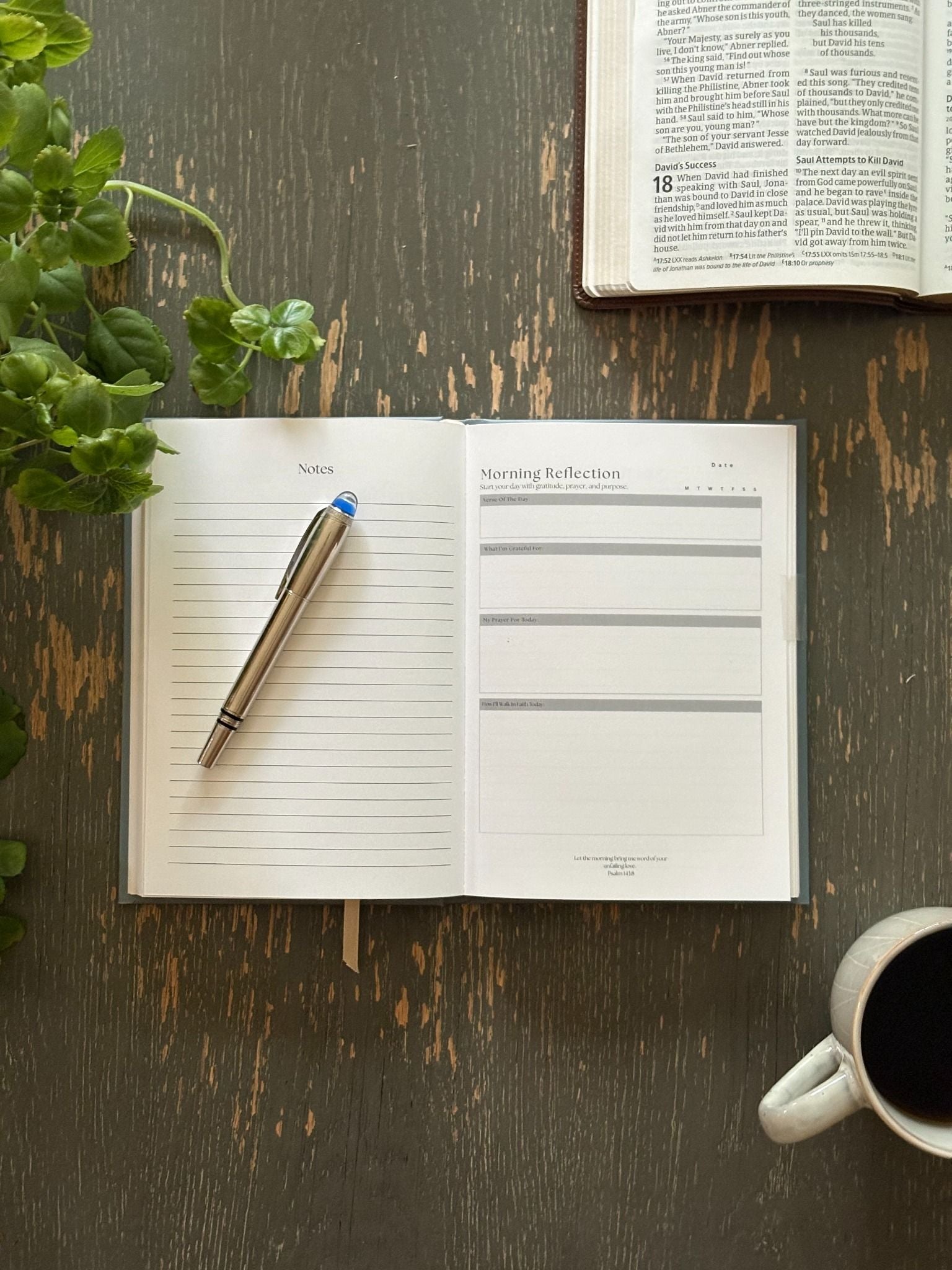 A premium, soft-touch journal designed to elevate your daily walk with God. Clean pages, guided structure, and a refined finish made for deeper clarity and spiritual focus.